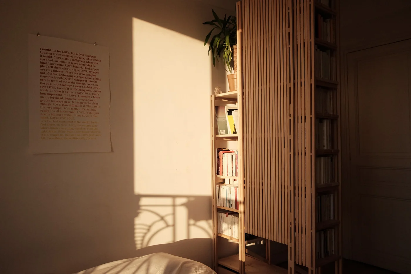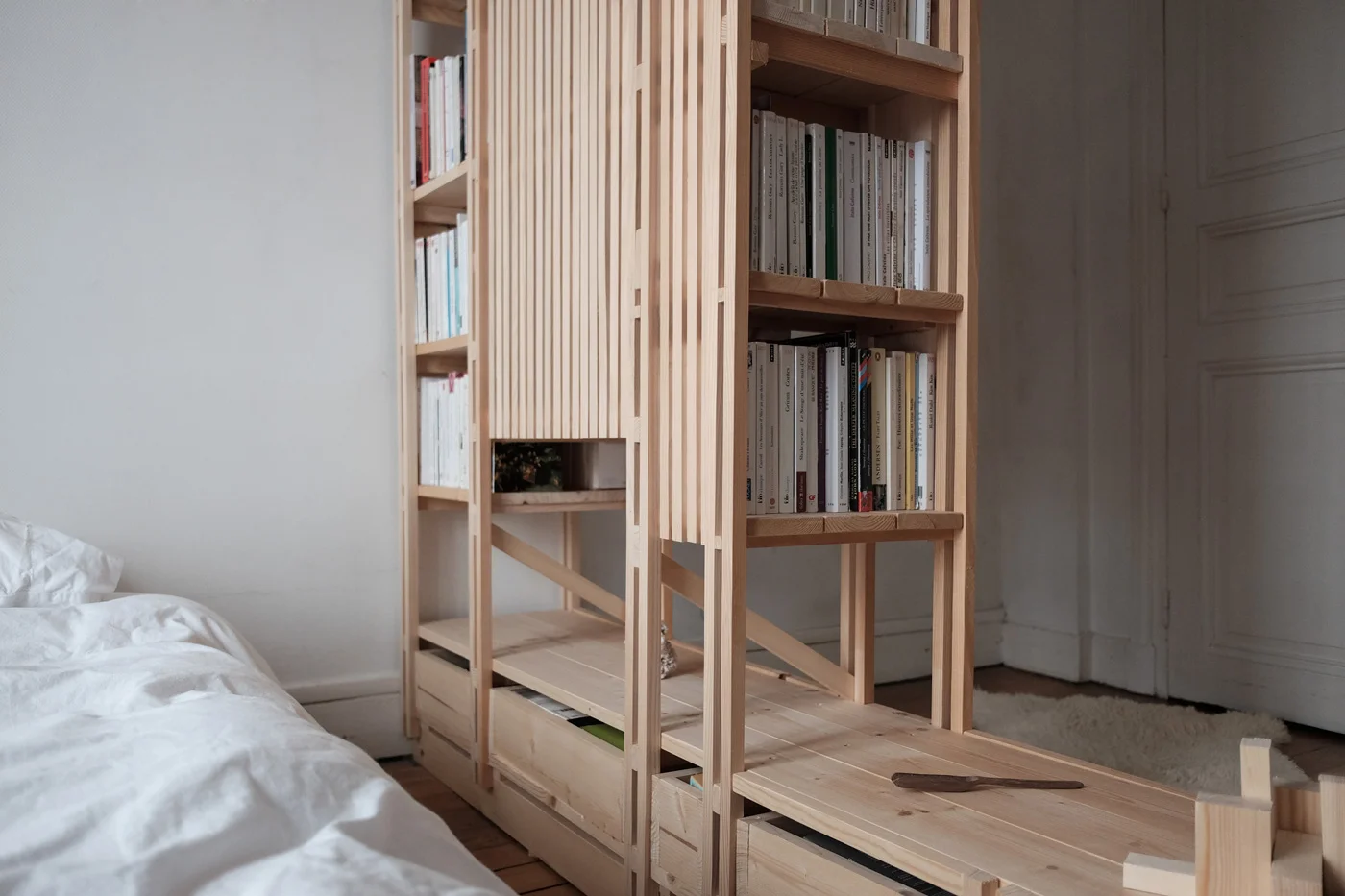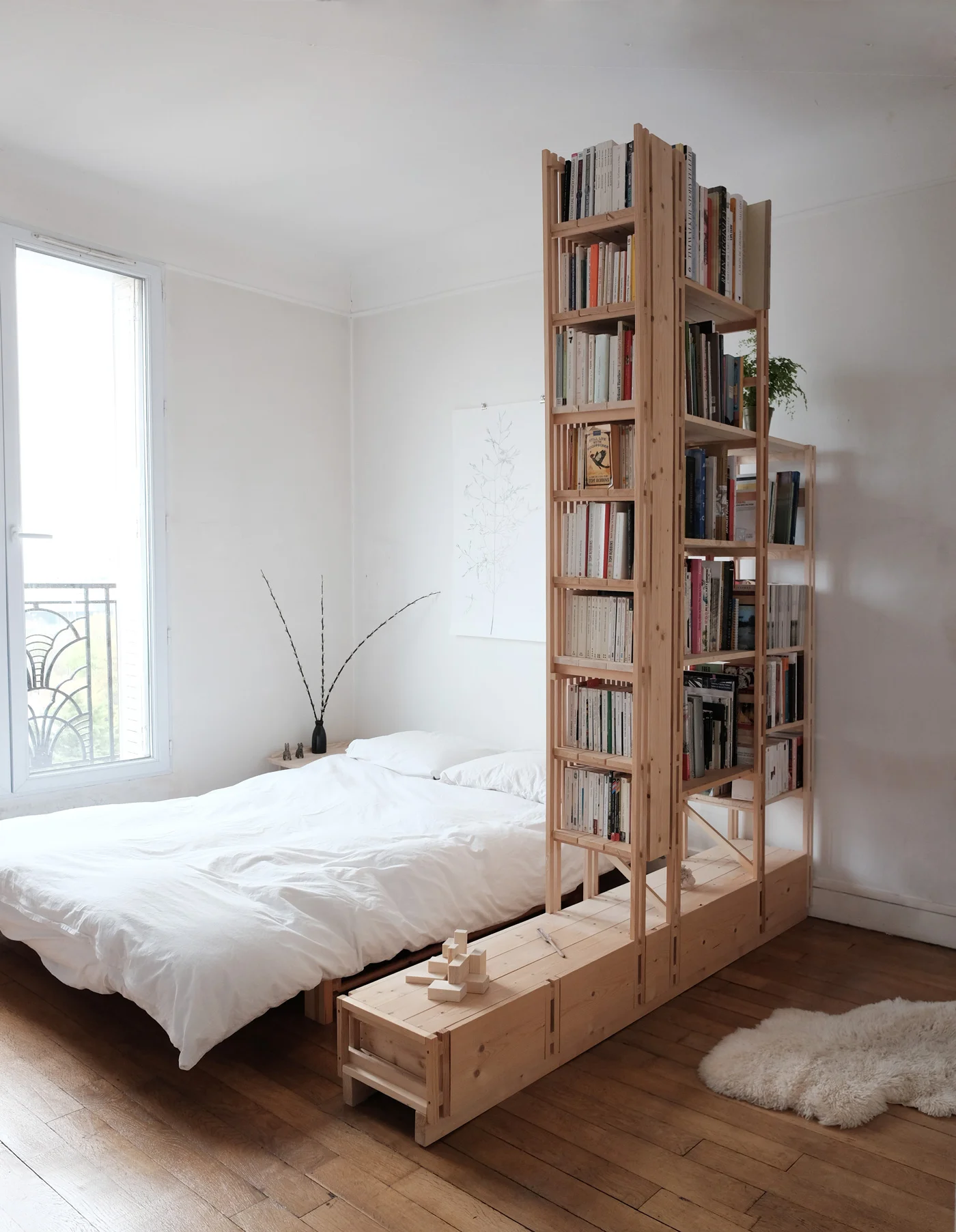 Made out of fir wood, this bookshelf and storage unit divides a small bedroom in a Paris flat between sleeping and reading or changing space, opening to both sides.